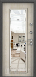 Белая входная дверь с зеркалом с повышенной звукоизоляцией и темной фурнитурой снаружи №21