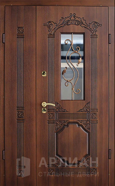 Двустворчатая входная дверь в частный дом со стеклом и решеткой №18