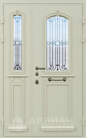 Металлическая двустворчатая дверь со стеклом и кованой решеткой №15