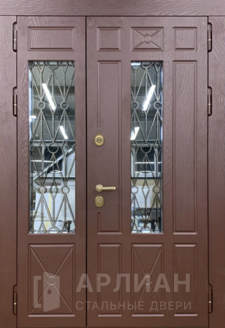 Двухстворчатая входная дверь со стеклом и ковкой №9