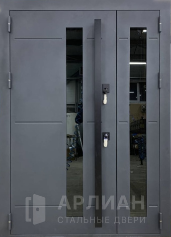 Входная двустворчатая дверь со стеклом и ковкой в загородный дом №14